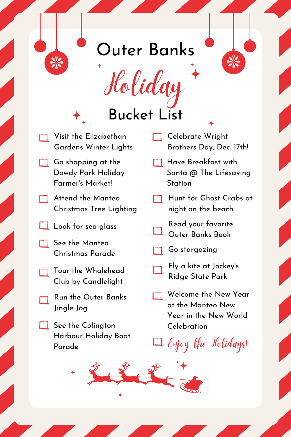 Visiting the Outer Banks is great any time of the year, but sometimes coming down for the holidays can be the best experience of all! With so many different things to do, it’s hard to keep it all in one place. But here’s our convenient Outer Banks Holiday Bucket List for you to take with you as you enjoy your Outer Banks holiday vacation! Whether you’re looking for an unforgettable Thanksgiving on the Outer Banks, the perfect Christmas present or those last-minute New Year’s Eve celebrations, you’ll find what you’re looking for on the Outer Banks! Be sure to stay up to date on holiday events taking place from November to January on the Outer Banks.